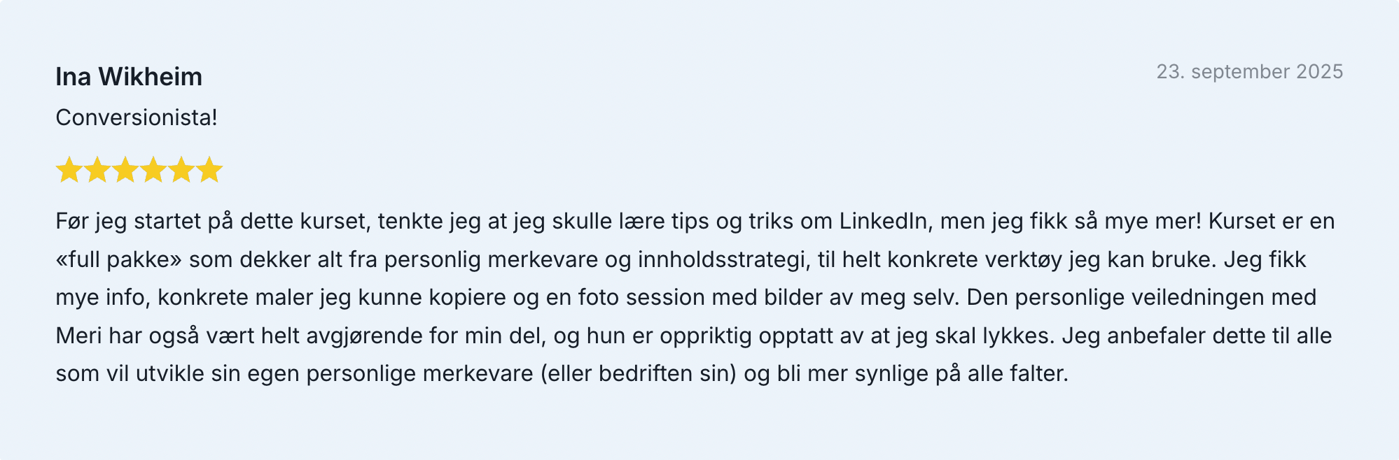 Du drar faktisk fra kurset med en personlig, gjennomførbar strategi, et skikkelig profilløft og praktiske verktøy for å produsere innhold raskere og bedre – som du kan bruke selvgående etter kurset.