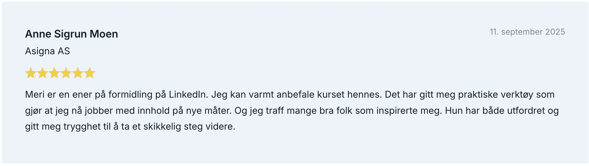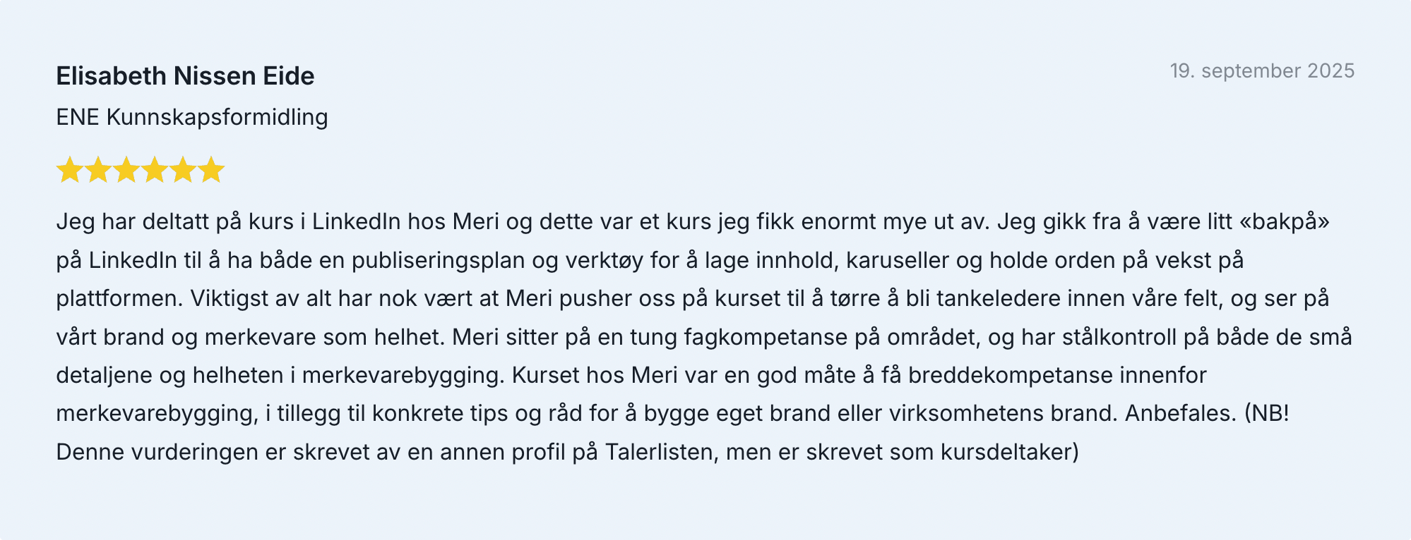 Noen av tilbakemeldingene på kurset, som har et snitt på 6/6 stjerner: